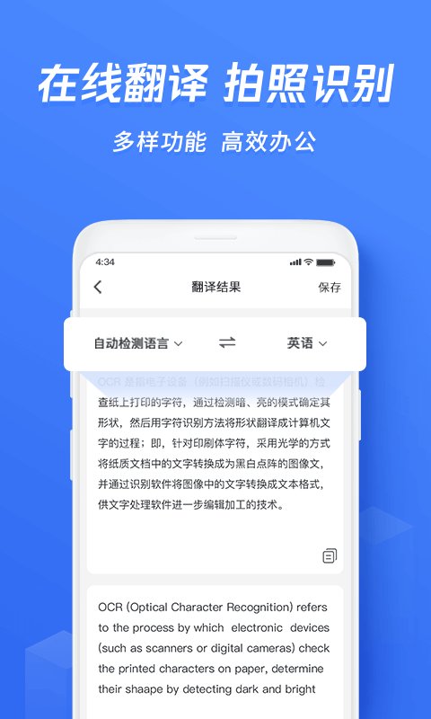 可连续拍照拼图,批量识别图文或即时拍照识别各种文件、图片、书籍等,准确迅速