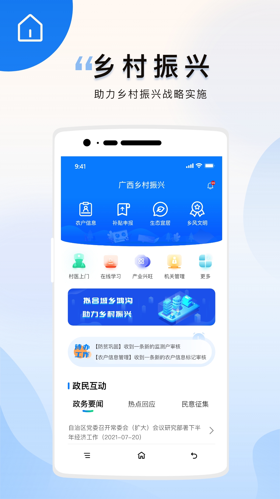 广西乡村振兴app是一款专为广西用户打造的乡村振兴服务软件,功能十分的强大,各种功能板块划分的十分清楚,大家可以随时在上面查看乡村规划,各种待办事项全都可以清晰的看到,发布最新政策、资讯信息,展示乡村文明风光,享受更便捷的生活服务,有效治理,轻松管理,专注乡村建设,助力乡村振兴。有需要的用户快来下载使用吧!!