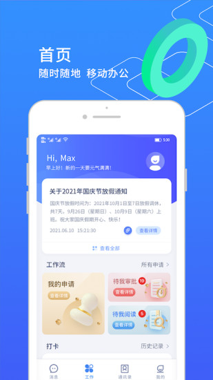 高效协作办公系统,能快速的安排和分配工作,有效的工作流程,随时随地的办公。把工作带到世界各地,只有有网络的地方就是办公室。全h5化开发,有利于个性化的改造。组价话设计,谁都是移动办公的开发者,精美的界面设计。