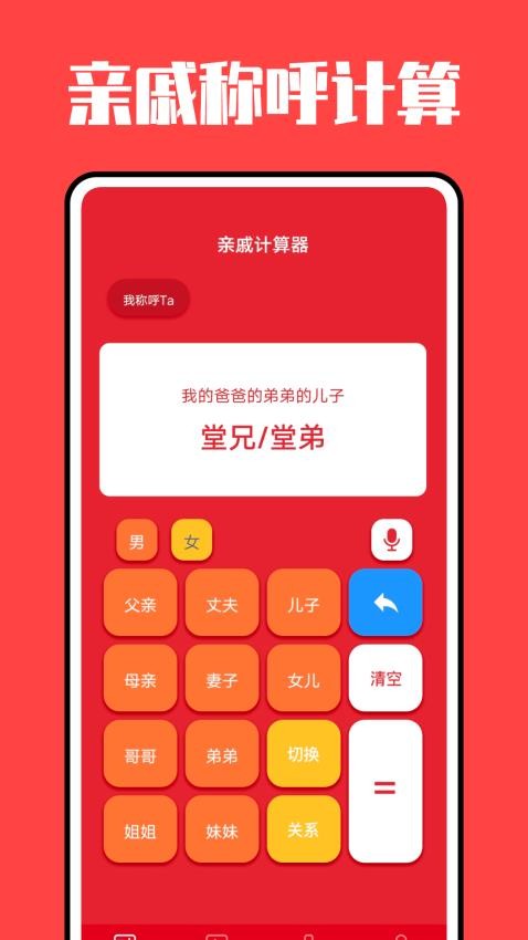 亲戚称呼计算器是一款简单易用的软件,旨在帮助用户快速计算出亲戚之间的称呼关系。这款软件适用于各种场合,无论是家庭聚会、走亲访友还是婚礼庆典,都能让你轻松应对亲戚称呼的难题。