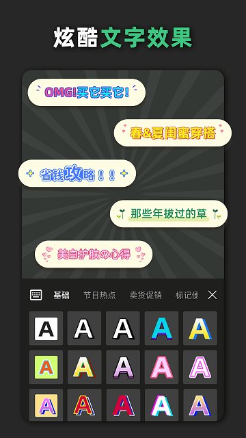 「编辑功能强大」:支持新建画板设计,多种花字特效 ,众多图文组合样式,支持图片的多种边框和滤镜效果处理