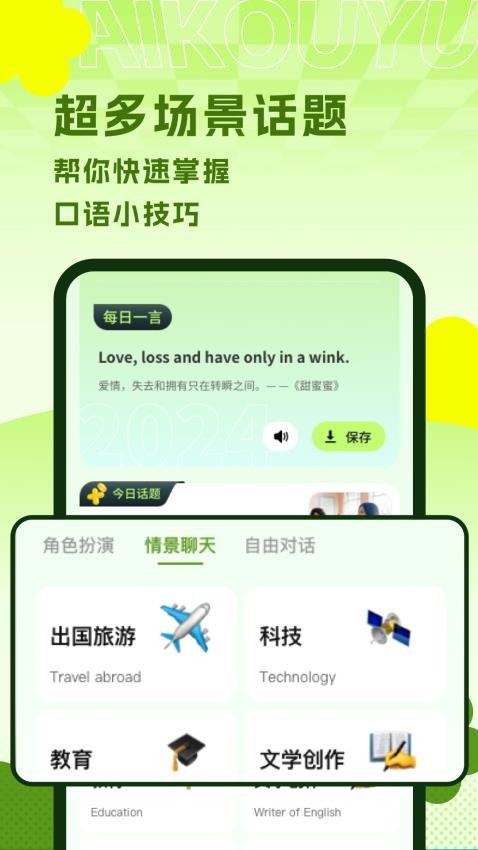 2. 真实场景模拟:软件内置多种真实场景对话,如日常交流、商务谈判、旅游问路等,让用户在不同场景中实践口语技能。