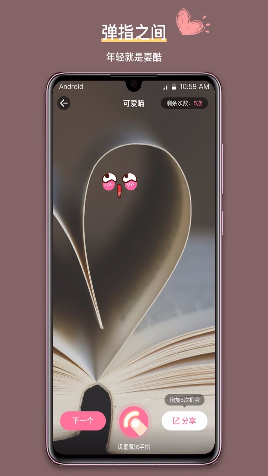 3. 效果预览:滑动手指,屏幕会跟随出特效,例如爱心发射、例如瘦瘦瘦、例如飘出冰淇淋。