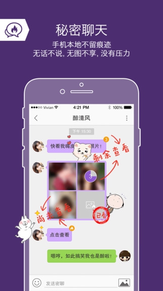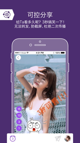 3、自定义照片限时分享(1-15秒),文字消息阅后即焚,无法转发、无法复制,聊天无记录,八卦无压力!