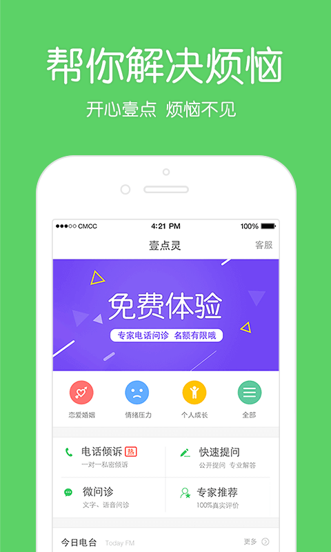 壹点灵平台上有数百名专业心理咨询师,为用户提供个性化、高质量的心理健康服务。用户可以在平台上进行心理测评,了解自己的心理健康状况,同时也可以在平台上找到适合自己的心理咨询师,进行在线咨询或预约线下咨询。此外,壹点灵还提供心理课程、心理社区等丰富多彩的内容,帮助用户更好地了解心理健康知识,与他人进行交流分享。