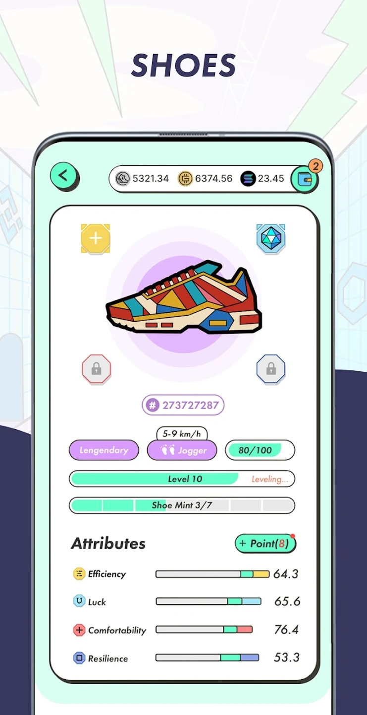 STEPN是世界上第一款由Solana首款移动端「move2earn运动赚取Token的NFT游戏,玩家可以在其中赚取 GST游戏代币,可用于铸造新NFT运动鞋或兑换稳定币。带有编号的前10,000个NFT鞋盒将全部免费空投给社区成员,让用户伴随产品一起成长。该游戏拥有 move2earn 机制、Shoe-Minting 功能以及游戏内钱包系统,玩家将能够自由交易 NFT 运动鞋和 Tok