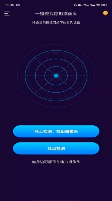 1、通过手机连接的Wi-Fi一键检测同局域网下的摄像头设备,高精准协议检测,实现防偷窥检测;