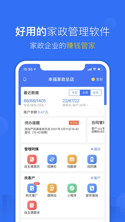 电商经营:文章、海报、小程序一键推广,客户、阿姨简历、电子合同转型电商化。