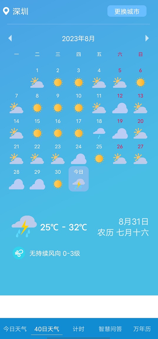 4. 实用功能:除了基本的天气查询,还提供了一些实用的天气相关功能,例如日出日落时间、紫外线指数、穿衣指数等。
