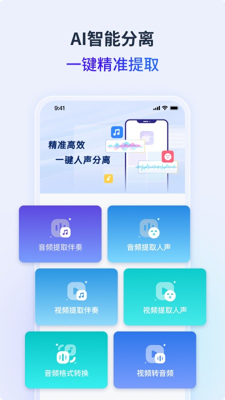1. 人声分离:将混合音频中的人声和伴奏进行精准分离,提取出清晰的人声或纯净的伴奏。