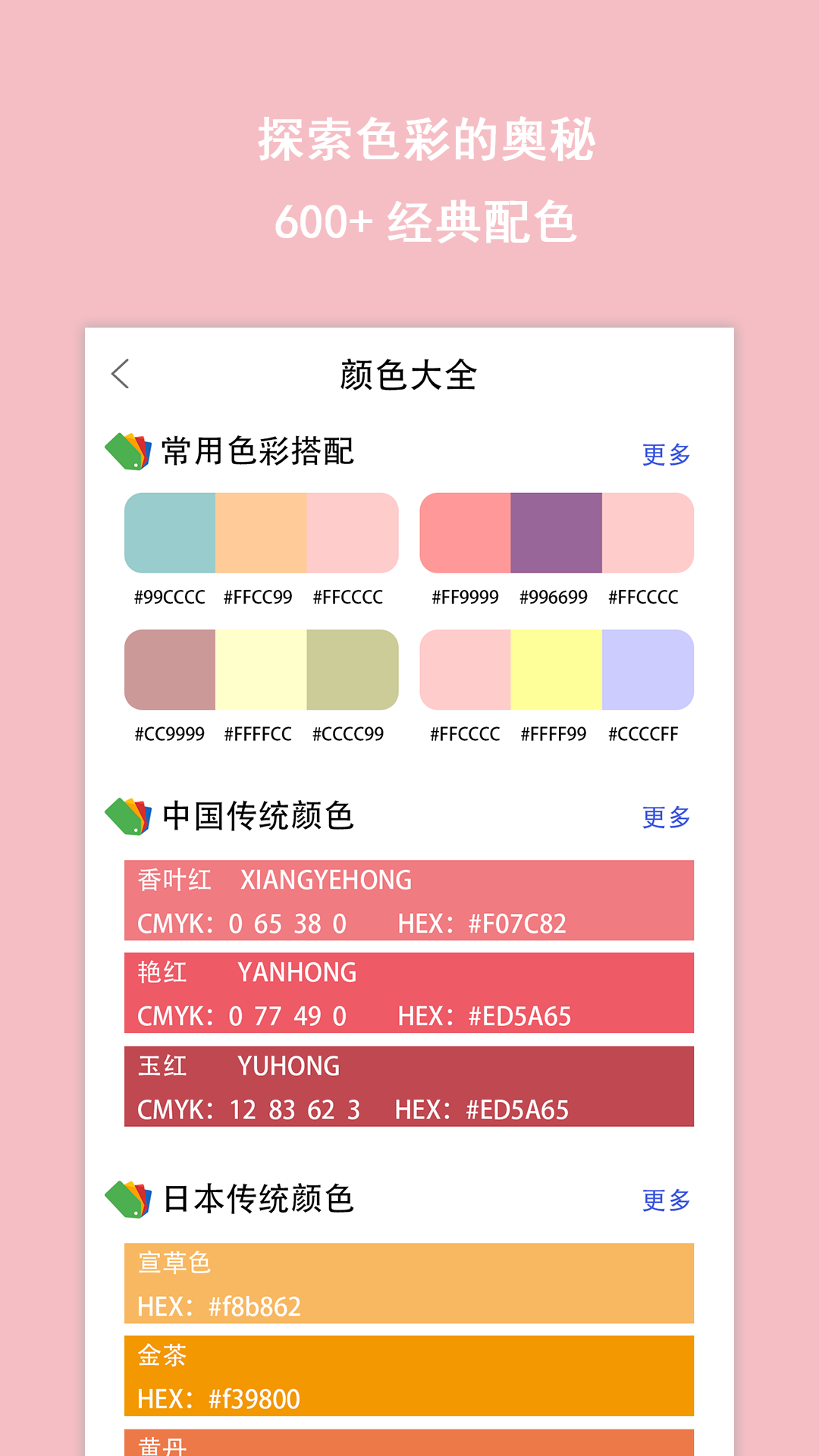 2、灵感探索配色,中西经典艺术作品和自然风光中提取的500多种原创配色;