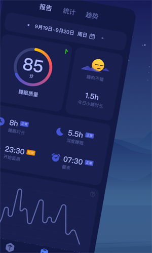 每日睡眠质品质报告:可以了解睡眠品质,深浅睡眠时长;睡眠分析和统计:平均睡眠品质、睡眠时长、入睡和起床时间;睡眠品质趋势图,以便更好地管理自己的睡眠品质变化。