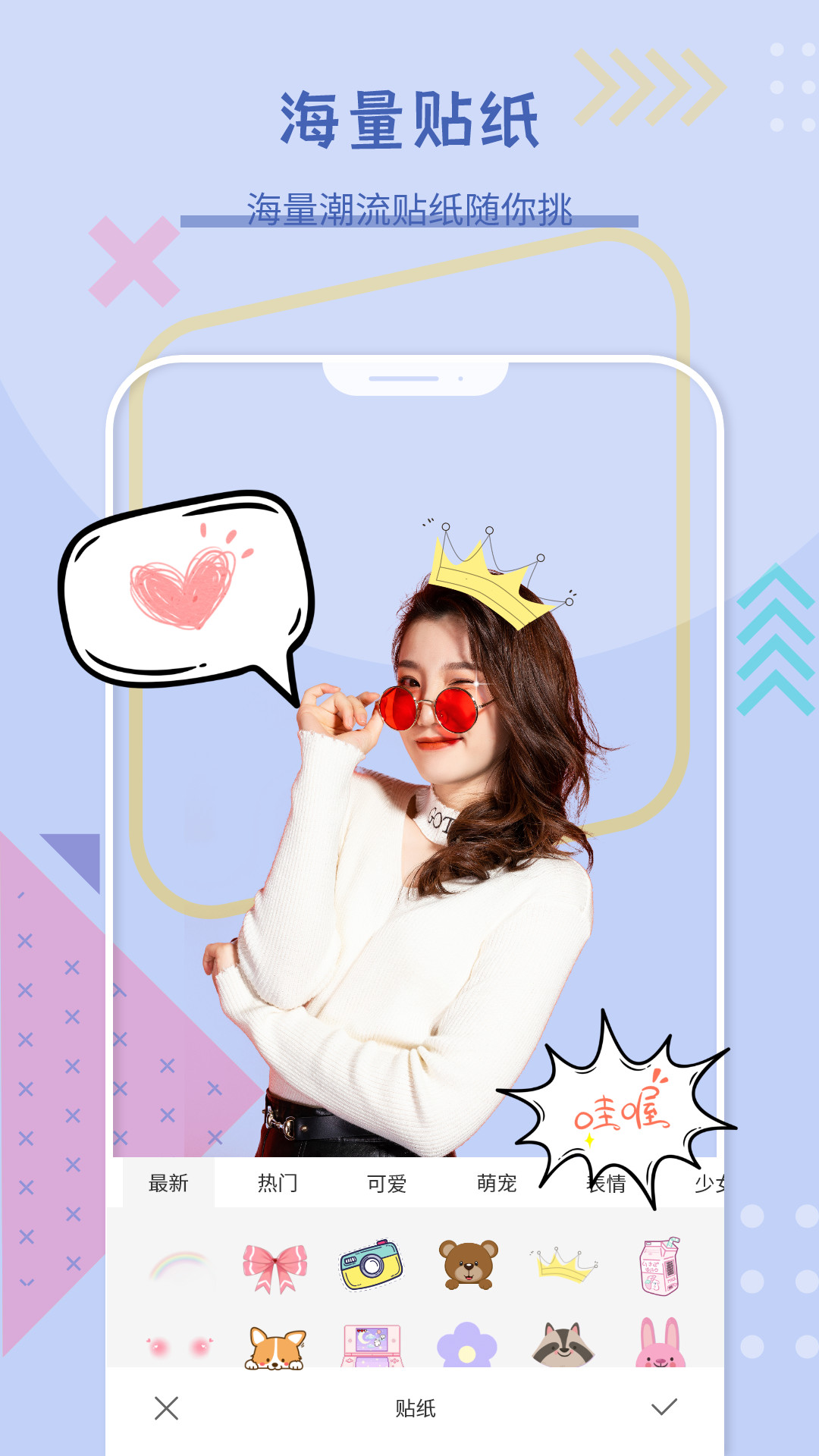 超多类型贴纸是本款APP的一大特色,你可以选择最新、热门、可爱、萌宠、表情、少女等不同的类型,每个类型中都包含海量贴纸,让你爱不释手!