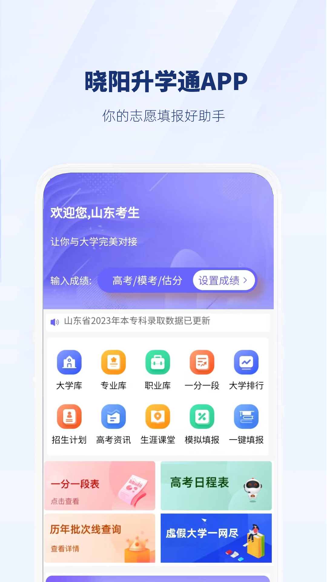 晓阳升学通是一款专为学生和家长设计的升学规划软件,旨在帮助用户了解各类教育信息,为未来的升学之路提供全面的指导和建议。