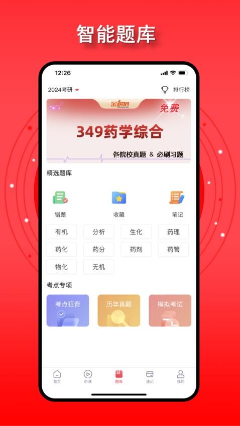 金榜君app是一款专为药学考研学生设计的辅助学习工具。它集成了丰富的药学知识资源、智能学习管理功能和高效的学习策略,旨在帮助考生系统地复习药学知识,提高学习效率,为药学考研的成功奠定坚实基础。