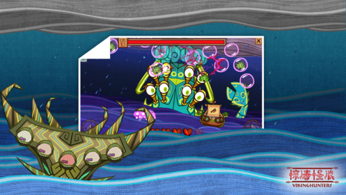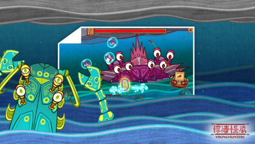 还需要避开波涛和海鱼的攻击,直到海怪的生命值为零,才能赢得战斗!