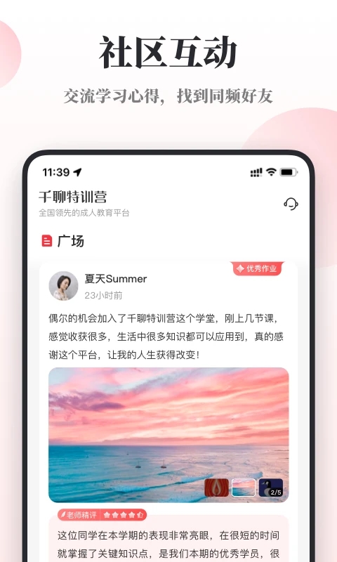 千聊特训营为以女性为主的用户提供名师教学、贴心陪伴、精心实效的全领域成长课程,千聊特训营专注成人教育,以“发现我的能量”为slogan,通过IP名师教学和助教陪伴的双师模式,对每个课程的知识技能点都配备十年以上专业教研把握课程内容,确保学员从“知道”到“做到”。