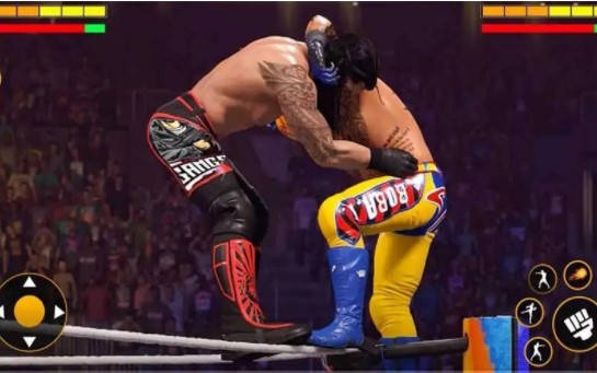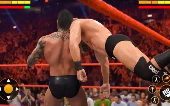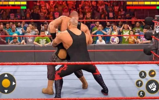 2,有很多摔跤手可以选择,每个人都有自己的特技,使用虚拟操纵杆控制移动位置,使用虚拟按键做出攻击动作。