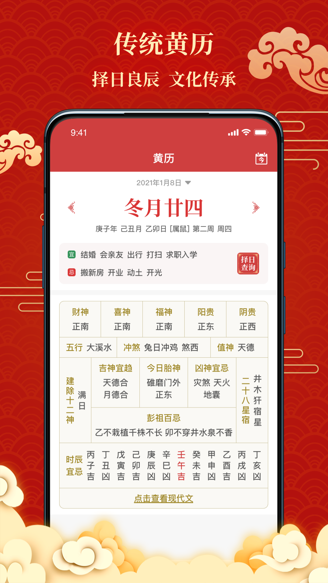 ①日历:黄历宜忌、节日节气、吉日查询、历史查询;