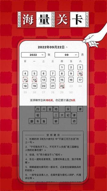 澎湃填字是一款填字主题的小游戏,玩家们可以学习到很多的填字的相关的知识,很是具有挑战性,游戏可以提升自己的储备的知识,满足不同玩家们的需求,这款游戏没有任何的限制,而且还有一些谜题,难度适可以快速的升级的哦~个性化的关卡设定,快来下载试试吧!