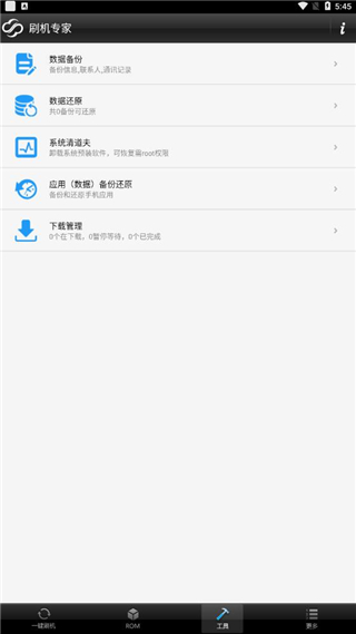 卓大师刷机专家是一款记录用户手机数据,并备份数据库,操作简单,使用方便的安卓手机刷机软件,提供一键刷机、一键root、应用管理等功能,还内置详细的刷机教程,帮助新手快速掌握刷机方法。赶快下载体验吧!