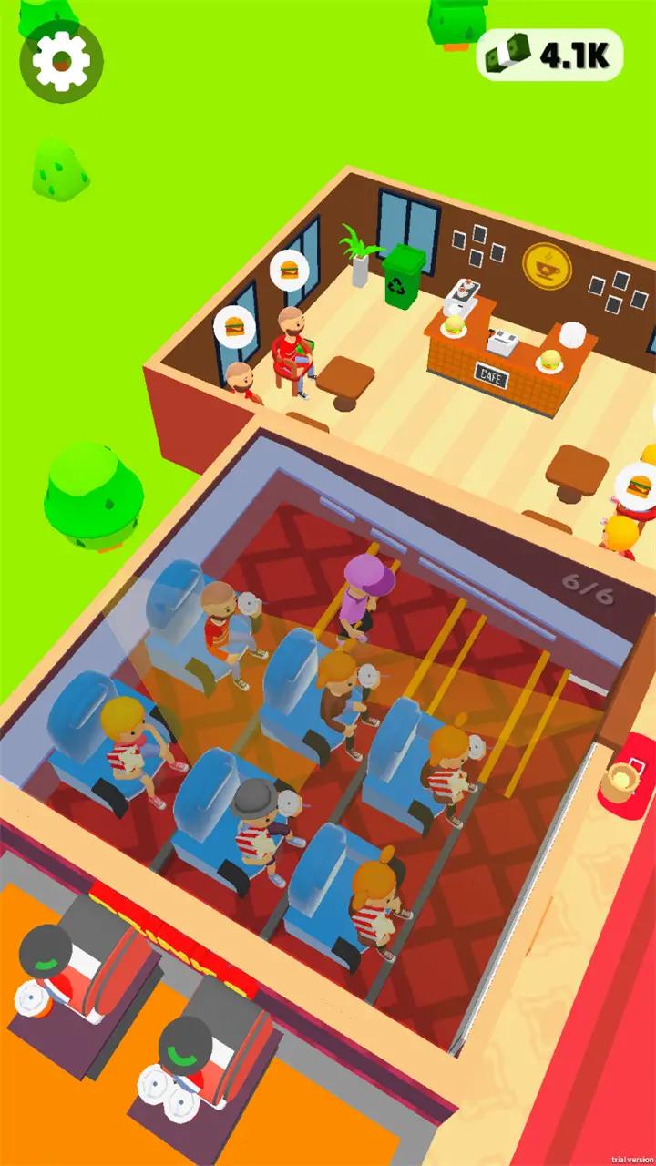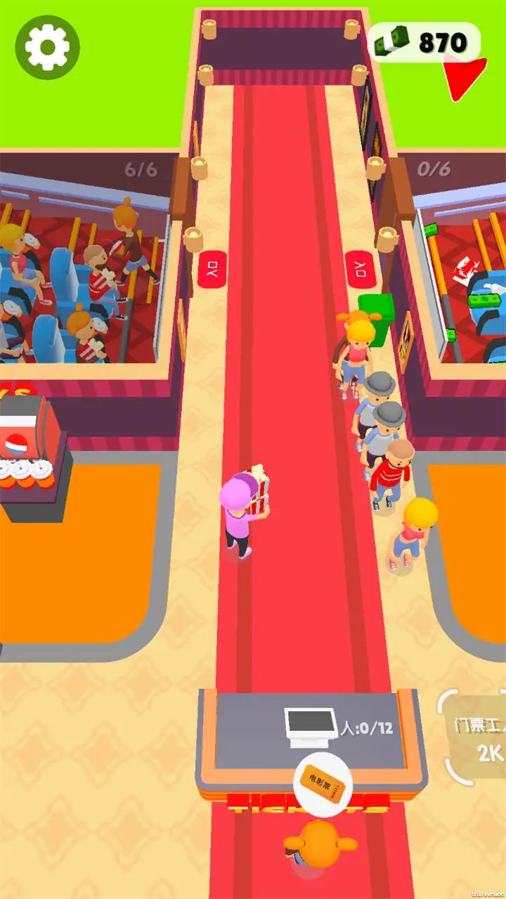 电影院模拟经营游戏,玩家将扮演影院服务员的角色,照顾影院内的各项服务,解锁更多座位迎接更多观众,及时补充影片保证播放质量,并为每位观众提供茶和水送爆米花,提高观众的观影体验,从而获得更多奖金。使用奖金解锁更大的屏幕和服务设施,赚取更多的钱。