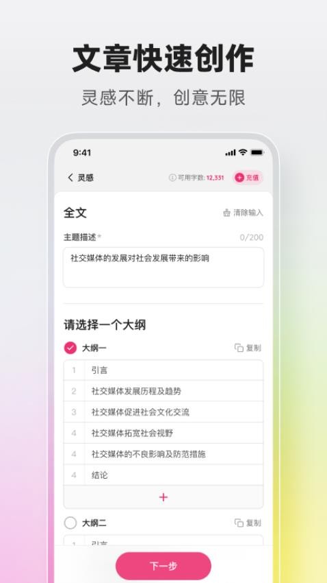 2. 智能生成:该应用采用了先进的自然语言处理技术,能够根据用户输入的关键词和主题,自动生成内容丰富、结构清晰的文章。