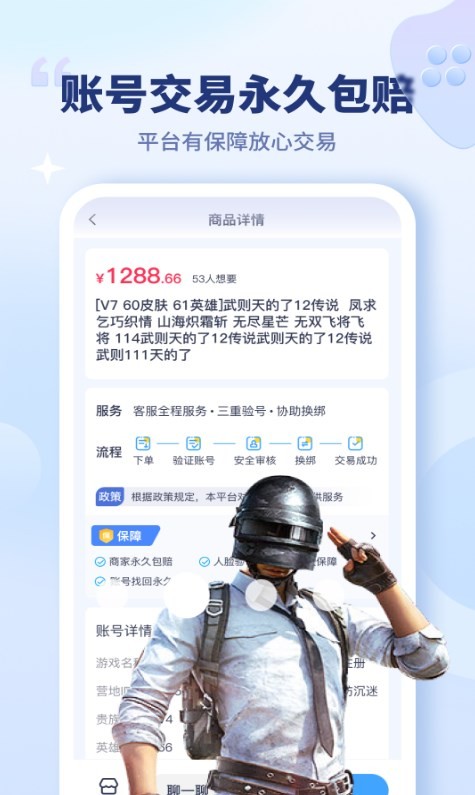 4. 账号保障:平台提供多种账号保障服务,包括找回包赔、封号包赔等。