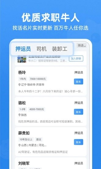 高效找活:每日更新万条司机、押运员、装卸工招工信息,求职者可筛选联系,也可发布找活名片曝光,提高找活效率