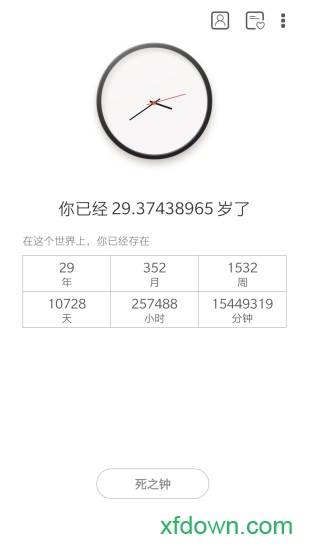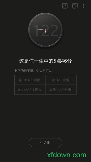 2、与生中钟对应的死之钟,你需要选择自己会在多少岁去世。当然这里只是需要你对自己进行一个猜测与预判,你可以自由选择一个你预测自己死亡的年龄,当然你也可以拒绝!当选择好年龄之后便会显示目前是你人生中的几时几分,在剩下的日子里你还可以吃多少顿饭、XX多少次、度过多少个周末、享受多少个长假。建议亲身体验一下看到这种数据的那种感觉,是喜悦还是心酸…