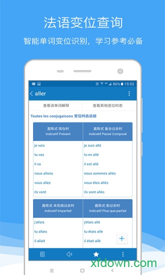 - 法语动词变位查询,提供18种时态的动词变位反查功能;