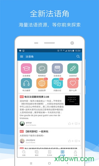 法语助手app是一款非常不错的法语翻译软件,功能强大且完全免费使用。该软件拥有与桌面版相同容量的词库,包括了法汉词典、法语近义词词典、法语专业词典以及法法、法英等大量词库,是一款法语学习者的辅助工具。而且就像英语字典对于学英语的朋友来说是一样的,对于学习法语的朋友来说,你可以在这里搜索你想要了解的词汇,或者听听正确的发音读法等等。不仅提供几乎所有动词的完整变位方法,同时整理分类近百种特殊动词的变位规则,帮助使用者尽快掌握法语动词变位,让你轻轻松松学习法语,从此不必再为法语的学习烦恼。另外可以将整篇法语文章全部翻译成汉语,没有字数限制,反之软件也能将整篇汉语翻译成法语,非常的方便实用。还等什么呢?一款不可多得的法语翻译软件千万不要错过了,喜欢的朋友快来下载体验吧!