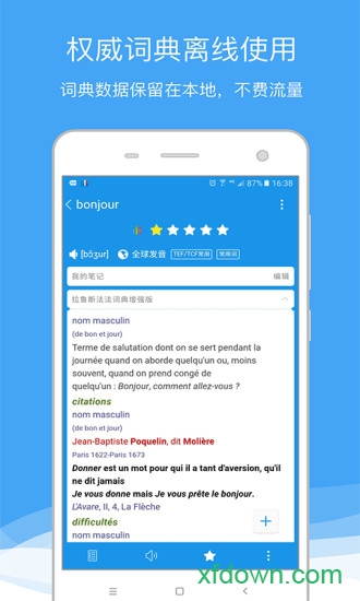 - 拥有与桌面版相同容量的词库。包括了法汉-汉法词典、法语近义词词典、法语专业词典以及法法、法英等大量词库