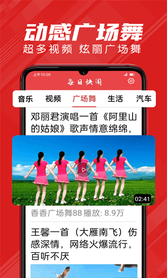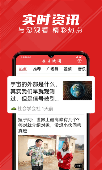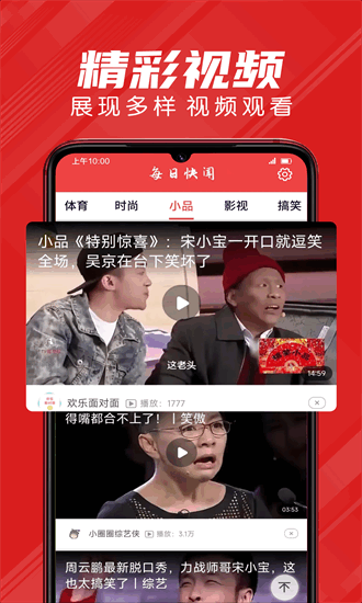 每日快闻提供了最优质的资讯,当有热点事件发生时它会及时追踪并且后续相关报道也会展开。你可以在上面看到精彩的小品和体育赛事等视频,同时可以将其分享给好友。它能满足大多数用户的需求,快来下载吧。