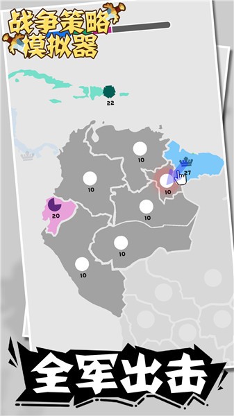 即时IO战略游戏,玩家通过合理的派遣兵力,进行领地守护及攻占,最终击败敌人占领全图,取得胜利。游戏之初,玩家会有少数已占领的领地,可以源源不断的生产出士兵,通过积攒士兵以及对地方操作的判断,在保住自己已占领的领地的情况下,合理出兵进行攻占敌方领地。开动大脑,为了扩张帝国而战,将属于你的颜色铺满整个地图!