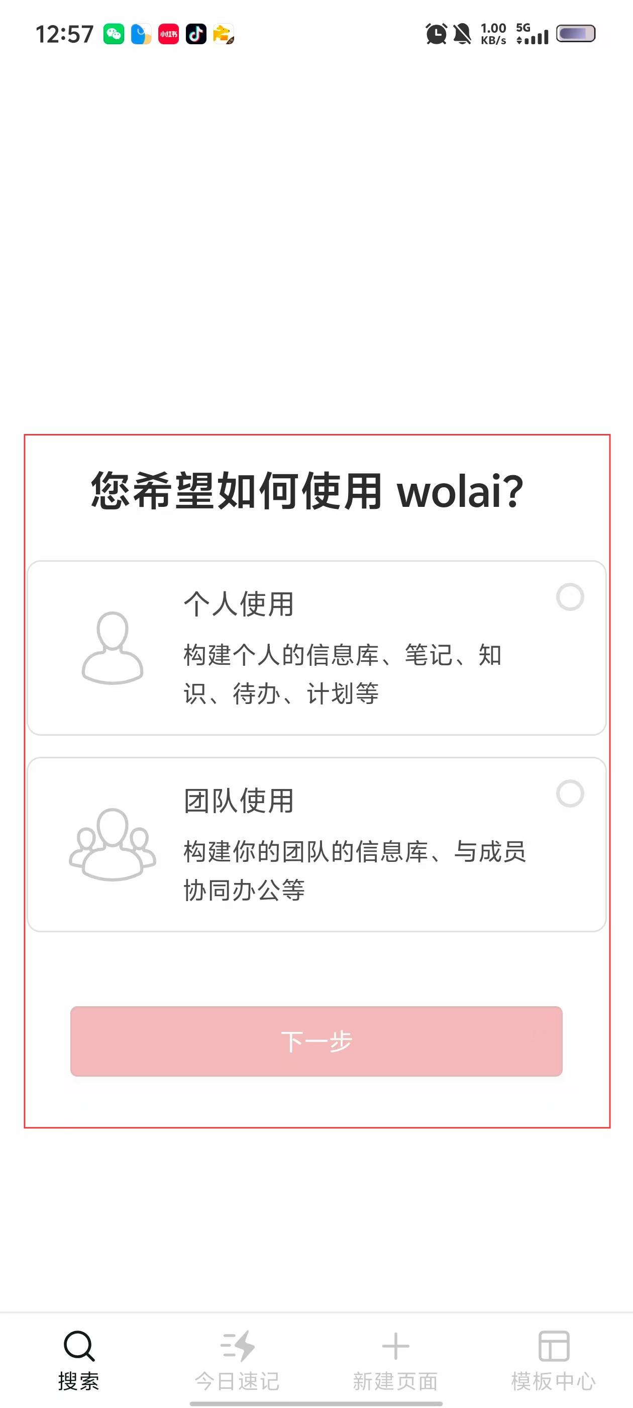1、首次使用我来,选【个人使用】或【团队使用】,点【下一步】。