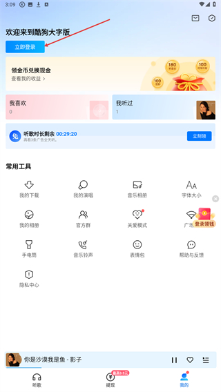 打开酷狗音乐大字版APP后,点击首页右侧的【点击赚钱】进去,每邀请1个好友注册填写你的邀请码可以获得1元红包,这个活动暂时不认设备。