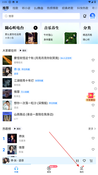 1、在酷狗的底部导航栏,点击我的选项,进入个人中心界面。