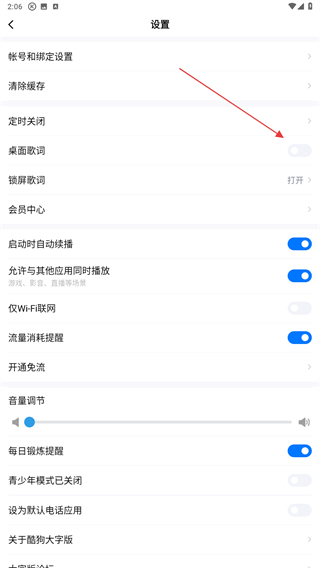 3、在设置的页面内,找到桌面歌词并点击右侧的开关。