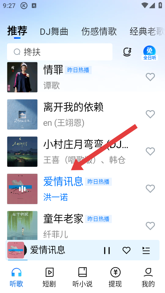 1、打开酷狗音乐APP,在听歌的页面,点击想要播放的歌曲如示例中的爱情讯息。