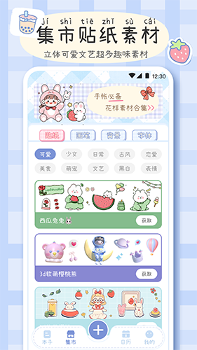 2、丰富的素材选择:提供贴纸、背景、字体等素材用于装饰手帐页面。