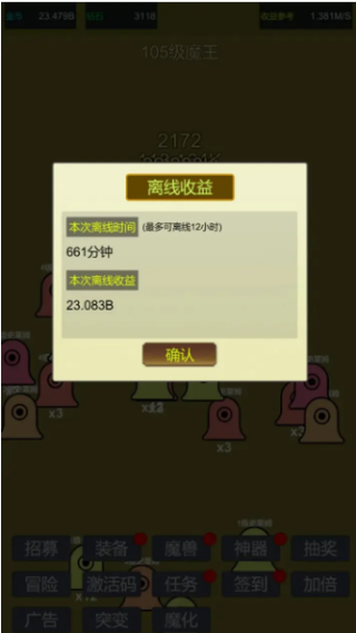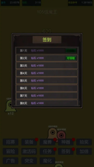 4、挑战2级魔王时依靠已有史莱姆自动作战,同时留意任务和签到红点,及时领取奖励提升收益效率。