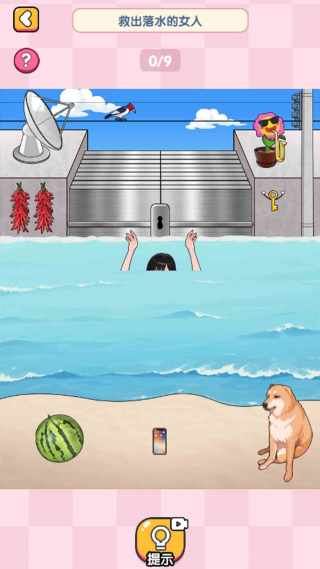 3、进入少女落水关卡,图中的女生快要被水淹没,你需要利用图中的物品或信息来打开门锁放出水解救她。