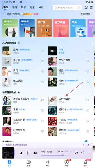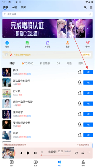 2、进入录歌的页面内,在推荐下选择并点击要k歌的歌曲。