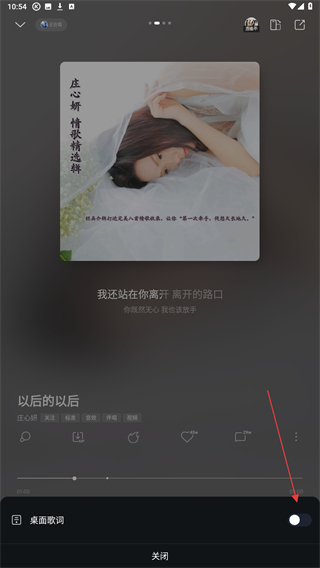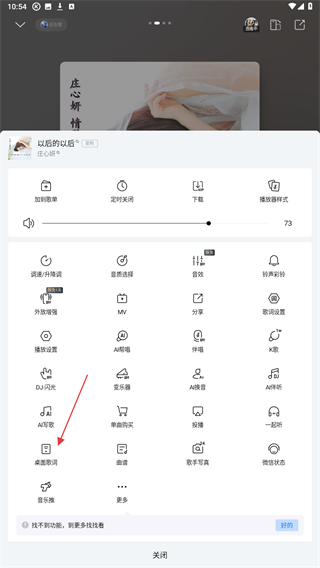 3、在弹出的操作列表中,找到并点击桌面歌词的选项。