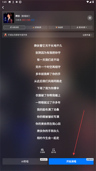 3、进入预备录歌的页面内,点击右下方开始演唱的按钮即可。