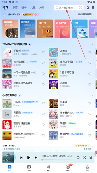 1、打开酷狗的应用,进入首页点击上方搜索框。
