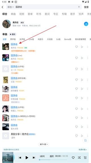 3、当搜索结果出来后,找到目标歌曲点击即可。