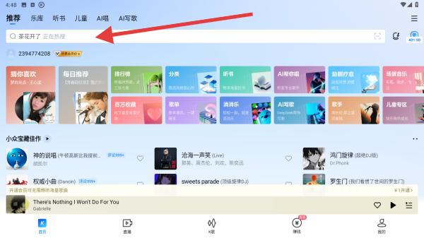1、打开酷狗音乐APP,点击首页顶部搜索栏,激活输入框。