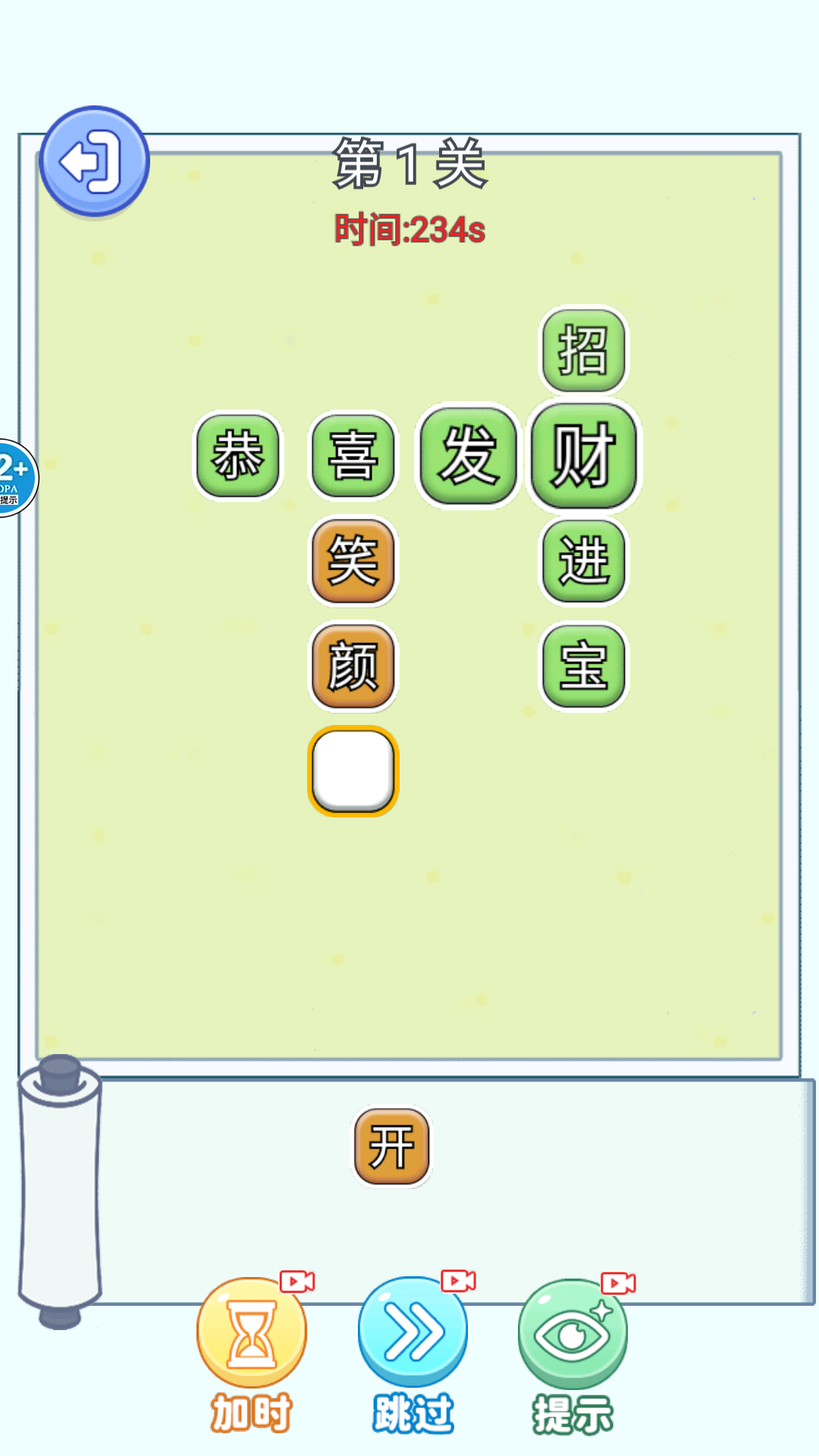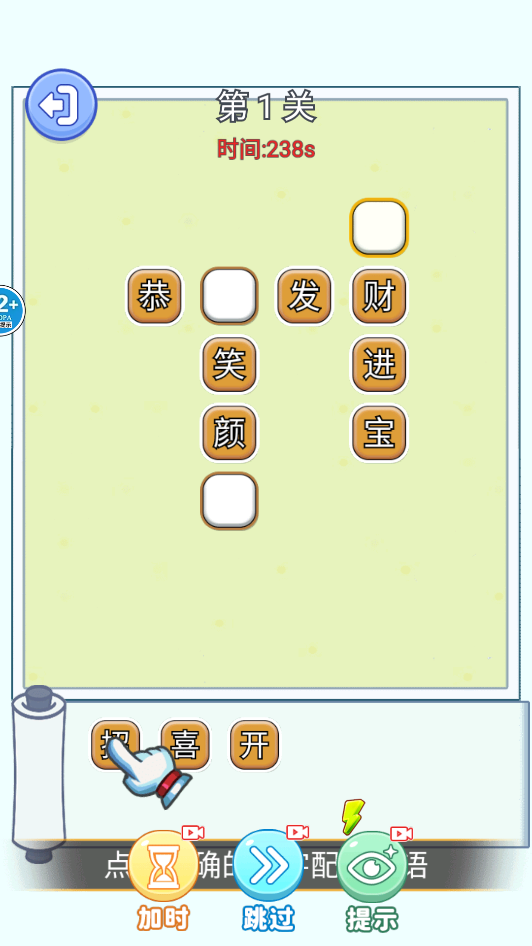 2、我选的是成语配对,第一关很简单,干着手指去点击下方的字快速闯关。